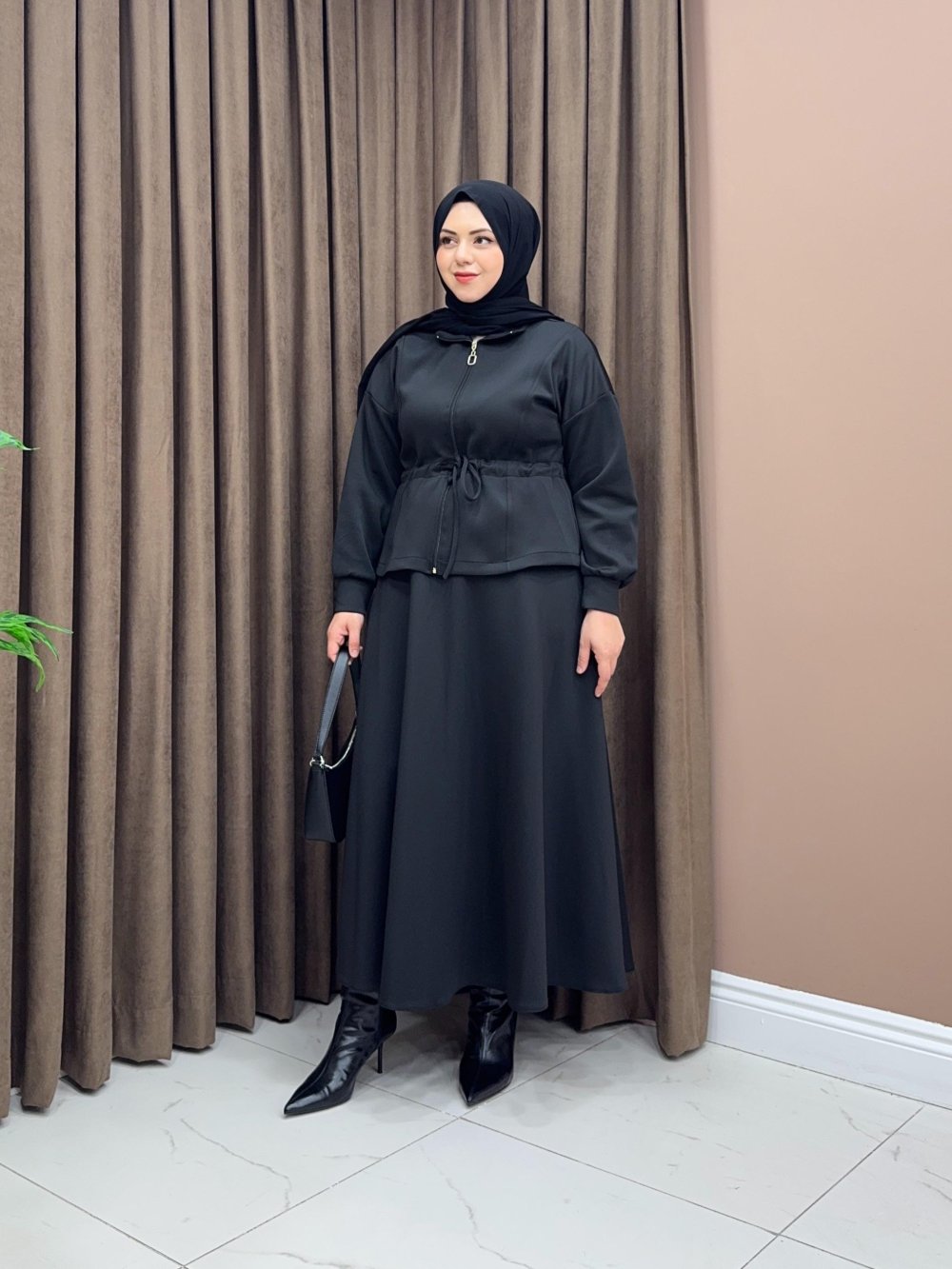 Scuba kumaştan üretilmiştir, etek beli lastikli ve rahat formdadır. Hırka boydan fermuarlı ve bel bağcık detayı mevcuttur.