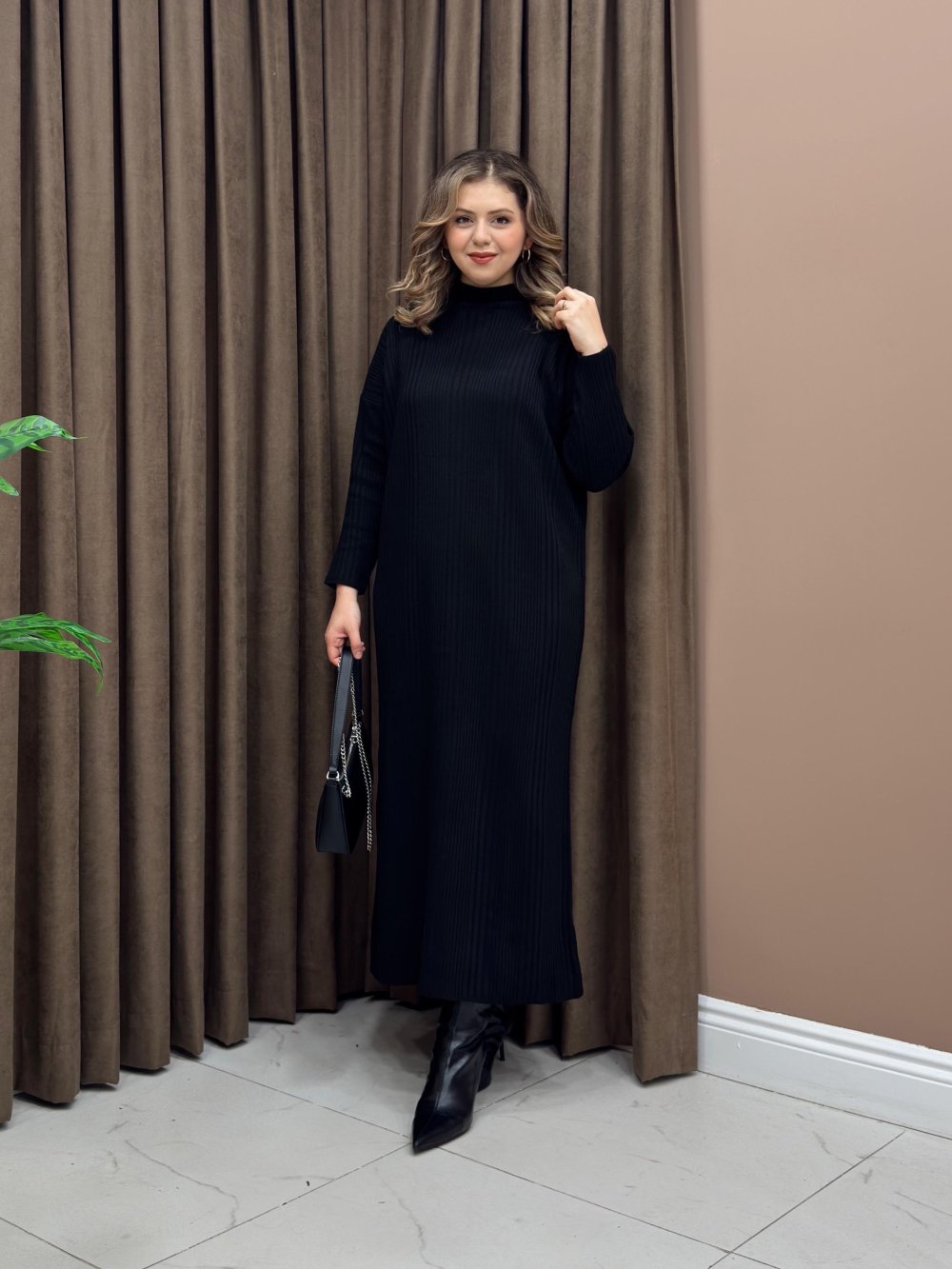 Fitilli Triko Elbise - Siyah